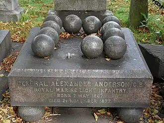 Anderson is buried in Brompton Cemetery in London.[4] His memorial is an unusual composition of cannonballs, one of which has disappeared. In 2018 the missing cannonball was replaced and the group has been added to. Three of the cannonballs are inscribed, individually bearing the words 'Beyrout', 'Gaza' and 'Syria'. The grave lies on the east side of the main path, midway between the north entrance and the colonnades.