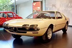 The Alfa Romeo Montreal was introduced as a concept car in 1967 at the Expo 67, held in Montreal, Quebec, Canada.[3] Originally, the concept cars were displayed without any model name, but the public took to calling it The Montreal.[4] It was a 2-door 2+2 coupe designed by Marcello Gandini at Bertone using the 1.6-litre engine of the Giulia TI and the short wheelbase chassis of the Giulia Sprint GT. Paolo Martin is credited for the prototype's instrument cluster. One of the two concept cars built for Expo 67 is displayed in the Alfa Romeo Historical Museum in Arese, Italy, while the other is in the museum storage.[2]