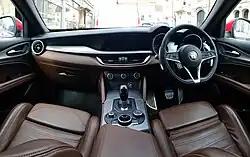 The car's engine lineup is similar to that of the Giulia's, with a turbocharged 2.0-litre inline-four and a 2.2-litre diesel inline-four. The Quadrifoglio trim level offers a 2.9 litre 690T twin-turbo 90° V6 rated at 510 PS (375 kW; 503 hp), developed for Alfa Romeo by Ferrari.[18] In Europe, consumption standards use the WLTP measuring system, which increases accuracy for consumption and emission figures. On 29 September 2017, a Quadrifoglio model set a Nürburgring lap time of 7 minutes, 51.7 seconds, the fastest for a production SUV.[19]