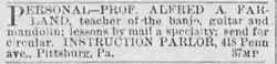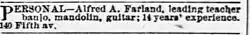 Alfred A. Farland, 1891 advertisement, music teacher 14 years experience