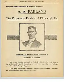31. ^ a b "A. A. Farland the banjo virtuoso" (PDF). S. S. Stewart's Banjo and Guitar Journal: 7. December 1898.