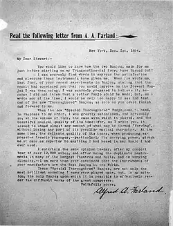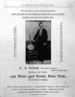 Farland had a business relationship with S. S. Stewart, endorsing Stewart's banjos and appearing in photographs in Stewart's Guitar and Banjo Journal holding Stewart's banjos.[39][40] For about 10 years, Farland toured the United States, traveling as much as 1000 miles in a day and playing classical music on one of Stewart's banjos.[23][10] He played Steward's Thoroughbred banjos, instruments which were hand-picked at the factory for their superior sound.[41][42] Some of Farland's audience was aware of the elite instrument, commenting on it in a letter to Stewart, which was published in his journal.[43]