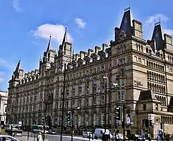 Waterhouse continued to practice in Manchester for 11 years, until moving his practice to London in 1865. At this stage of his career most of his commissions were either in the north-west or north-east of England. His earliest commissions were mainly for domestic buildings. Among Waterhouse's first commissions in 1854 were for his family: a set of stables at Sneyd Park, for his father, who had moved to Bristol, and alterations to the home of his uncle Roger Waterhouse at Mossley Bank in Liverpool.[11] In executing the commission for the cemetery buildings at Warrington Road, Ince in Makerfield (1855–56), he began his move towards designing public buildings in his developing Neo-Gothic style, building a lodge for the registrar, and two chapels, one Church of England in Gothic style, and one for Roman Catholic and Non-conformists in Norman style.[12] His first commission for a commercial building was for the now demolished Binyon & Fryer warehouse and sugar refinery in Chester Street, Manchester (1855). The building was of two floors made of brick with stone dressings and Italianate in style. The intended upper floors based on the Doge's Palace remained unbuilt.[13] Also he designed the Droylesden Institute (1858, demolished) in the Manchester suburb of Droylsden. It contained a reading room and other educational facilities and had some Gothic details. A similar building was the Bingley Mechanics' Institute built (1862–65), located in Bingley, with a hall and reading room in a Gothic style.[14]