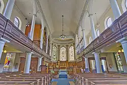 In Nantwich, Churchside, Waterhouse designed the former Manchester and Liverpool District Bank (1863–66), built of red brick. It included the manager's house.[15] Waterhouse's first completely new parish church was the Anglican St John the Divine (1863), Brooklands Road, Sale, Cheshire. It is Gothic, built of Hollington stone, with aisles and transepts, patterned brickwork inside, with external stonework of a single colour. The design of the roof is also restrained compared with Waterhouse's later designs.[16] Other early chapels included three for the Congregational church, Ancoats (1861–65, demolished), Rusholme (1863, demolished) and the Besses o' th' Barn (1863) now United Reform church, all were Gothic in style.[17]