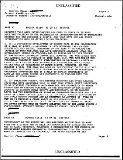 In 1999, the Defence Intelligence Agency (DIA) concluded that there was no evidence to support the accusations regarding General Mario Montoya Uribe's involvement in Triple A, citing the information as "a NGO smear campaign dating back 20 years".[5] This denial took place before the National Security Archive's request and subsequent declassification of the 1979 Embassy document.[2]