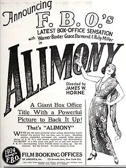 Alimony is a 1924 American silent drama film directed by James W. Horne and starring Grace Darmond, Warner Baxter, and Ruby Miller.[1][2] In the United Kingdom it was released under the title When the Crash Came.