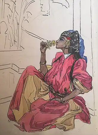 Between 1917 and 1919, 23 of her short stories appeared in the Revue de Paris, which were jointly published in 1919 under the title: Le harem entr’ouvert (Half-open harem). The book consists of two parts, Tunisian and Moroccan, and presents the problems of indigenous women such as their confinement and their dependence on man, but also their everyday pleasures. In the "Tunisian" novels, the European narrator is easily identifiable with the author, while in the second one, inspired by the writer's stay in Morocco, she uses vocabulary and phrases indicating that the narrator is a part of the Maghreb world. Some short stories in the "Moroccan" part are also inspired by classical Arabic poetry and the tradition of public storytellers.[10]
