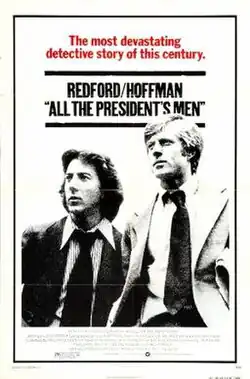 Susan Stark of the Detroit Free Press wrote, "The circuitous, sometimes perilous, nearly always frustrating adventure of the two newsmen who broke the conspiracy of silence about the Watergate scandals makes one terrific chunk of material for a movie, Wisely, Robert Redford, who acquired screen right to the book even before it was published, stuck to his gum, leaning hard on the dramatic, as opposed to the political elements in the material. The hard dramatic approach of the film, envisioned by Redford and executed with consummate skill by Alan J. Pakula, works wondrously well, from just about any point of view. In aesthetic terms, it works because the film carries no unnecessary expository baggage. No one is preaching here; no one is pushing a message, except by implication."[36] Joe Pollack of the St. Louis Post-Dispatch wrote, "Making a movie hero out of an investigative newspaper reporter is an extremely difficult task. Investigative reporting simply isn't very exciting, nor very dramatic. It involves a lengthy search for sources and tedious checking and cross-checking of facts, combined with an amount of telephone-calling and door-knocking that can become very dull. All the President's Men has turned these potential minuses into gigantic pluses, and comes through as a wonderful motion picture, one that explores the abuses of power and the work of the free press with a mighty magnifying glass. It glorifies the work of the reporter without making it glamorous."[37] Sally Smith of The Atlanta Constitution said, "A 'reporter' movie in the tradition of the '30s and '40s it is not. There are no fast-talking, cigar-chewing editors, no screaming telephones and no thundering presses. 'Scoop' is never mentioned. Instead, the film is close to a dramatized documentary. For those in the audience expecting an emotional catharsis it may be slightly disappointing, but this low-key realism as opposed to being a shrill polemic against Nixon is why the movie works."[38]