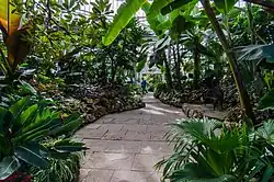 The original domed conservatory was expanded several times during the 1920s, and in 1956 and 1957, with the addition of five new greenhouse.[3][4] In 2004, a sixth greenhouse was opened at the conservatory.[6] In total, the conservatory's six greenhouses cover approximately 1,500 square metres (16,000 sq ft).[1] Two greenhouses are used to house begonia, bromeliads, gesneriads, and orchids.[5] Other greenhouses in the conservatory include a cool temperate greenhouse that houses camellias and plants from Australia and the Mediterranean; a palm greenhouse for a number of palm and tropical vines; the tropical landscape greenhouse for plants like cycads, hibiscus; and the arid house for cacti and succulents.[5]