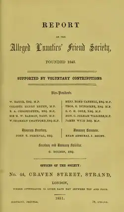 John Perceval was listed as the honorary secretary, Luke James Hansard as treasurer, and Henry F. Richardson as honorary solicitor (Gilbert Bolden would later become the Society's lawyer). Sixteen vice-presidents included both Tory and Liberal MPs; notable amongst them was the radical MP for Finsbury, Thomas Duncombe. New legislation, championed by Lord Ashley, was being introduced in parliament (the Lunacy Act 1845 and County Asylums Act 1845) and the creation of a formal society put the group in a better position to influence legislators. Four days after the Society was founded Thomas Duncombe spoke in the House of Commons, arguing for the postponement of new legislation pending a select committee of inquiry, and detailing a number of cases of wrongful confinement that had come to the Society's attention.[7] The legislation however went ahead, and the Society would have to wait until 1859 for an inquiry, although the Society's supporters in parliament managed to secure a number of clauses to safeguard patients in the 1845 Act.[8]
