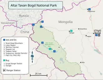 Altai Tavan Bogd National Park (Mongolian: Алтай Таван богд байгалийн цогцолбор газар, ᠠᠯᠲᠠᠢᠲᠠᠪᠤᠨᠪᠣᠭᠳᠠᠪᠠᠶᠢᠭᠠᠯ ᠤᠨᠴᠣᠭᠴᠠᠯᠠᠪᠤᠷᠢᠭᠠᠵᠠᠷ Altai five saints nature complex) is a national park in Bayan-Ölgii Province of western Mongolia. The park includes the Mongolian side of the Tavan Bogd massif, which is divided by the triple border with Russia and China in the Altai Mountains.[1][2]