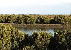 The Park has predominantly saltmarsh vegetation including shrubby glasswort and beaded glasswort, which provide food for the rare orange-bellied parrot.[8][9] It has at least 8 regionally rare plant species,[1] including the White Mangroves (Avicennia marina) along the southern banks of Kororoit Creek[10] .
