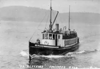 Alverene was first operated under the command of Capt. John H. Prather (b. 1868), a prominent businessman of the Whidbey Island cooperative community of Freeland, Washington.[5] Shortly after Alverene was completed, the vessel was seriously damaged in a docking accident that occurred on August 16, 1912, at Everett. The accident caused by the much larger steel-hulled steamship Sioux.[1] In 1914 Alverene was providing regular service to the community of Greenbank, Washington.[4]