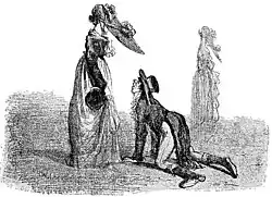 Cham was known for his racist portrayal of French people of colour.[1] He was specifically targeting black women and drew them as animal-like, stereotyped caricatures. One example is his caricature of Alexander Dumas crossed dressed like a wet nurse, which was a popular profession for black women in the post-slavery era in 19th-century France.[1] In a different caricature, he referred to the milk of a black wet-nurse as "black shoe polish."[1]