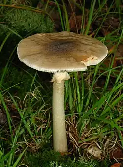 The stem is 8.5 to 16 cm (3+3⁄8 to 6+1⁄4 in) long by 0.9 to 1.6 cm (3⁄8 to 5⁄8 in) thick, and slightly thicker at the base than at the top. It is stuffed with whitish hyphae that resemble cotton. The surface of the stem is smooth or has delicate tufts of soft, white, woolly hairs. There is a rimmed bulb at the base of the stem, which can reach a diameter of over 3 cm (1+1⁄8 in).[1] The ring—located on the upper portion of the stem, 1.2–1.7 cm (1⁄2–5⁄8 in) from the top[1]—is white, membranous, and long-lasting. The volva remains closely attached to the bulb, although a portion may stretch out like a thin membrane and adhere to the base of the stem before collapsing. The flesh will slowly turn pinkish-brown to chocolate-brown when it has been injured or bruised.[3] Young specimens do not have any distinct odor, but fruit bodies may smell slightly of onions or garlic in age.[1]