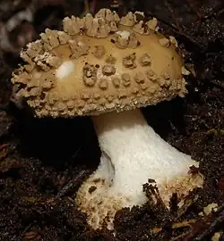 The shape of the A. australis cap is initially convex, later flattening out or even developing a central depression, and reaching diameters of 2–9 centimetres (3⁄4–3+1⁄2 inches) wide. The cap margin sometimes splits and rolls back to give a ragged appearance. The centre of the cap is dark buff, honey or isabelline, becoming paler to buff at the margin. The surface is sticky when young or wet, but dries out with age. The remnants of the volva form conical to pyramidal warts that are most densely aggregated in the center, but become sparse and low towards the margin. They are initially white then greyish-sepia or isabelline with white to buff tips.[1]
