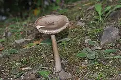 The cap is 3 to 10 centimetres (1 to 4 inches) in diameter and gray to grayish-brown in color; initially the cap is oval, then as it matures it becomes progressively conical, convex, and eventually flattened, sometimes with a small umbo (a rounded elevation in the center of the cap).[3] The gills are white, free (not attached to the stem) to narrowly attached, moderately crowded together, and sometimes have a grayish tint; the lamellulae (small gills that run from the edge of the cap towards the stem) are truncate.[4] The flesh is white and thin, and does not change color upon bruising.