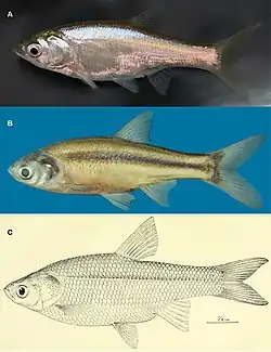 Amblypharyngodon grandisquamis, A in aquarium (~70 mm SL, not collected), Sri Lanka, Ulhitiya, Mahaweli River basin B in preservation (DZ 3193A, 74.0 mm SL), Sri Lanka, Polonnaruwa, Mahaweli River basin C illustration of the holotype of A. grandisquamis by Jordan and Starks (1917: pl. XLIV, FMNH 58964).[1]