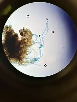 Only one Ambrosiella (A. cleistominuta from the xyleborine ambrosia beetle Anisandrus maiche) has ever been reported to produce sexual structures, and the rest (including A. roeperi) have been assumed to undergo exclusively clonal reproduction.[11] All Ambrosiella produce translucent, flask-shaped conidiogenous cells (phialides) borne on non-fertile sporodochia (minute, dense cushions of nonreproductive hyphae holding up the fertile tissue). Conidia may arise from these phialides as chains – i.e., new spores are successively pushed out, with the newest growth closest to the original conidiogenous cell – or singly, as an aleurioconidium that ruptures the membrane of the mother cell and then remains a unique, differentiated terminal unit without any subsequent neighbors produced from the phialide.[7][10] A. roeperi operates only through the latter mechanism, which is distinct from what is reported in A. beaveri, A. trypodendri, and A. hartigii (suggested to use the former, chain-like method).[2]