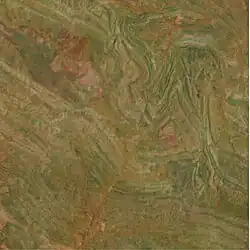 Amelia Creek crater is an impact structure (or astrobleme), the eroded remnant of a former impact crater, located in the Davenport Range, Northern Territory, Australia.[1] It lies within a low range of Paleoproterozoic sedimentary and volcanic rocks, which are extensively folded and faulted, thus making an eroded impact crater difficult to recognize. It was only discovered by the identification of shatter cones near its centre.[2] The central shatter cone locality is surrounded by a 20 by 12 km (12.4 by 7.5 mi) area of anomalous deformation, the asymmetry being possibly related to very oblique impact, but may be at least partly due to the preexisting structural complexity of the rocks.[3] This deformed zone gives the best estimate for the original size of the crater. Impact took place after folding of the Paleoproterozoic rocks but before deposition of Neoproterozoic and Cambrian rocks which overlie them, thus constraining the impact event to the interval between about 1660 and 600 Ma.[3]