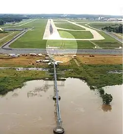 The aircraft continued past the end of the runway, traveling another 800 feet (240 m; 270 yd), and striking a security fence and an ILS localizer array. The aircraft then collided with a structure built to support the approach lights for Runway 22L, which extended out into the Arkansas River.[1]: 43  Such structures are usually frangible, designed to shear off on impact, but because the approach lights were located on the unstable river bank, they were firmly anchored.[1]: 159  The collision with the sturdy structure crushed the airplane's nose, and destroyed the left side of the plane's fuselage, from the cockpit back to the first two rows of coach seating.[1]: 159  The impact broke the aircraft apart into large sections, which came to a rest short of the river bank.[1]: 43