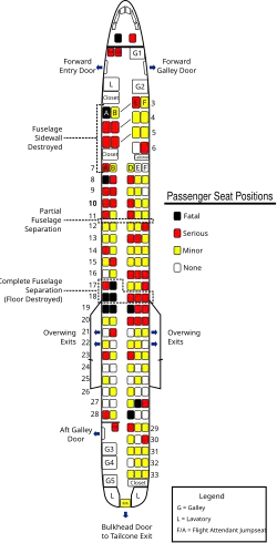 Seating chart for American Airlines Flight 1420 created by the NTSB, revealing the location of passengers and lack of injury, severity of injuries, and deaths