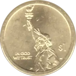 Four new coins will be released each year "celebrating innovations and innovators" from each of the fifty states, the District of Columbia, and the five U.S. territories (Puerto Rico, Guam, American Samoa, the U.S. Virgin Islands, and the Northern Mariana Islands).[5] All coins issued through this program will have the same obverse design showing the Statue of Liberty, and will contain the words: "In God We Trust" and "$1".[6][7]