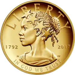 The obverse of the gold coin features Lady Liberty, portrayed as a youthful, African-American woman, wearing a crown of stars. It is also inscribed with the words "LIBERTY" behind Lady Liberty's hair, "1792", "2017", and "IN GOD WE TRUST". The obverse was designed by Mint Artistic Fusion Program (AIP) Designer Justin Kunz and engraved by Mint Sculptor-Engraver Phebe Hemphill.[10]