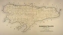 Amherst Island had been frequented, inhabited seasonally by Indigenous peoples who named it, Ka8enesgo translated as big, long island.[1] Amherst Island was known by the French as Isle Tonti, after Henri de Tonty, Lieutenant to La Salle during their explorations. Loyalist-era settlement had started by 1792 and the Island was thickly settled by 1835.[2] In a proclamation by the Lieutenant Governor of Upper Canada John Graves Simcoe on 16 July 1792, the Island was formally renamed to Amherst Island, in honour of Jeffery Amherst, 1st Baron Amherst, who was commander-in-chief of British forces in North America. Simcoe was renaming the archipelago to commemorate British Generals of the Seven Years' War: Wolfe Island, Amherst Island, and Howe Island.[3]