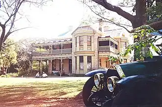 The formal homestead garden is approached through wrought iron gates hung on elaborately stuccoed brick gate posts set in a timber picket fence. The driveway and paths within this area are brick edged & guttered & were originally gravelled although they are now overgrown. There is an overgrown lawn tennis court and many superb trees, including Bunya pines (Araucaria bidwillii), silky oaks (Grevillea robusta), jacarandas (J.mimosifolia), orchid trees (Bauhinia x variegata cv.s),frangipanis (Plumeria rubra cv.s) & a Queensland bottle tree. The garden was sheltered from the prevailing winds by windbreaks of native olives & hedges of "Orange Honeysuckle" (Cape honeysuckle/tecoma (Tecomaria capensis)). Outlines of formal beds can still be seen in what are now lawns. The house is set on a hill overlooking what is called the "lagoon". This is a picturesque small lake which is a habitat for the many water birds which frequent the area. The lagoon & the area between it and the house are considered very important to the house's setting.[2][1]