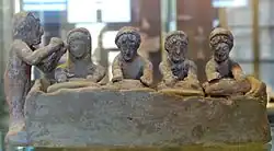 Bakers in the trough, a flute player gives the cadence, terracotta figurines from Thebes, 525 - 475 BC, Louvre Museum.