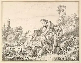 He etched plates which were completed by Jean Audran. One of these was La Moisson after Wouwerman. He executed more than thirty works, of which Saul consulting the Witch of Endor, after Salvator Rosa, was wholly engraved by him. He likewise etched Les Adieux after Wouwerman, Le pasteur galant after Boucher, La Conversation, L'Hiver, and Le Joueur de Quilles after Teniers, and also after Wouwerman The Death of the Stag which was finished by Thomas Major.[1][4]