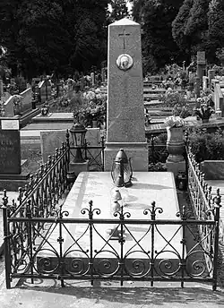 The early years of the Second Polish Republic placed onerous demands on Poland's judiciary which in turn reportedly[19] led to a high mortality rate amongst those who chose to keep working in the service of their country rather than retire. Grodyński died in 1925 and is buried at Cieszyn Municipal Cemetery, but outside the impressive family tomb erected by his father-in-law Alfons Matter. The funeral procession reflected his local, regional and national standing, with fellow judges, six priests and representatives across all levels of society, including the military, led by his close friend fr Józef Londzin.[20][21]