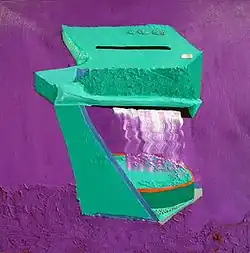 Zieliński's main body of work reflects on electronic devices that saturate our lives: cell phones, ATMs, computers, and paper shredders.[2] Zieliński's paintings are mixed media, which includes a variety of materials. The paintings are textured and have sculptural depth.. Often, he begins by painting wide strokes of interference paint which include titanium-coated mica flakes and change color depending upon the angle they are viewed from. Then, he outlines shapes painted thinly in acrylic with chalk or crayon and more paint. The result adds a third dimension to the traditional two-dimensional canvas.[3]