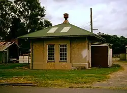 Adjacent to the western side of the Stock Experiment Station's northern wing is a small building, rectangular in plan with a Dutch gable roof clad with corrugated metal sheeting, weatherboard clad walls, and a concrete slab floor. The top section of the exterior walls is in-filled with mesh to the soffit allowing ventilation of the interior. A channel in the slab drains into a drainage trough running around the base of the south-western corner. A concrete ramp leads to a door on the side of the building and a large concrete open-topped tank is positioned next to the north-eastern side. The doors are timber, one having a screen. Some windows have been sheeted up to hold air conditioning units, while others are later aluminium-framed sliders.[1]