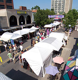The Ann Arbor Art Fair is a group of three award-winning, not-for-profit United States art fairs that take place annually in Ann Arbor, Michigan. Over 400,000 visitors attend the fairs each year. Prior to 2016, the fair ran Wednesday through Saturday, generally the third weekend in July. Beginning in 2016, the days shifted to Thursday through Sunday.[3] There was no event in 2020 as the COVID-19 pandemic was to blame;[4] it returned in 2021.[5]