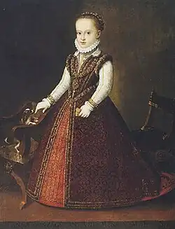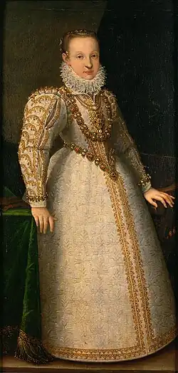 She was born Anna Caterina Gonzaga in Mantua on 16 November 1566 to Guglielmo Gonzaga, Duke of Mantua, and Eleonor of Austria[2][3], one of their three children. Her godfather was Philip II of Spain.[2] Contemporary accounts note that she was raised in a devout Catholic household, with Eleanor maintaining particular devotion to the Blessed Virgin Mary.[2] Anecdotal traditions claim that Anna was given a rosary by her parents to soothe her as an infant.[citation needed]