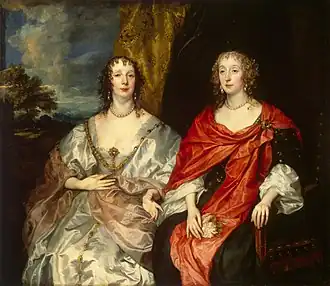 She is known to have been painted twice by Anthony van Dyck, once standing by herself[1] and once seated with a fellow lady-in-waiting, variously suggested to be Anne Dalkeith[6] or Charlotte, Lady Strange, Later Countess of Derby.[7][8]
