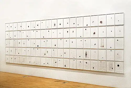 Anne Wilson's artwork explores personal and public practices of ritual and social systems, ideas of de-construction and re-construction in both microcosmic and macrocosmic worlds of public and private architecture, as well as themes of time and loss.[5]