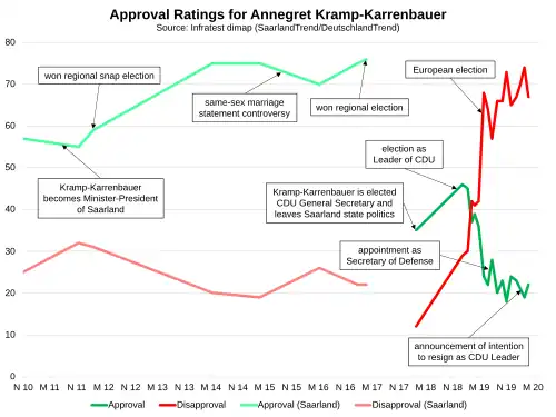 In the immediate aftermath of her election, surveys showed an increase in the CDU's vote share; however, it was short-lived. In the first months of her tenure, there were a series of gaffes and according to the press a failure to connect with voters.[22] In the run-up to the 2019 European Parliament election, which was seen as her first major electoral test, the CDU's campaign was embroiled by a row between the party and YouTube personality Rezo. It was caused by a viral YouTube video posted by Rezo in which he called out the parties of the governing Grand Coalition (CDU/CSU and SPD) and urged viewers not to vote for them.[23] Kramp-Karrenbauer reacted, stating that the electoral law should be changed to prevent social media personalities like Rezo from influencing the voters' choice in the midst of a campaign.[24] The statement was harshly criticized as an attack on freedom of expression and damaged the image of Kramp-Karrenbauer among young people. Shortly afterwards, a Bloomberg report stated that Chancellor Merkel thought that her successor was not up to the job, further hindering her popularity.[25]