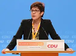 Annegret Kramp-Karrenbauer (German pronunciation: [ˈanəɡʁeːt ˈkʁamp ˈkaʁənˌbaʊɐ]; née Kramp; born 9 August 1962), sometimes referred to by her initials of AKK,[1] is a retired German politician who served as Minister of Defence from 2019 to 2021 and as Leader of the Christian Democratic Union (CDU) from 2018 to 2021.