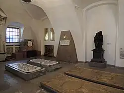 Those with close connections to the imperial court were also buried here. Among them were courtiers Yevdokiya Yusupova, Anastasiya Trubetskaya, and Anna Matyushkina; as well as Alexei Razumovsky, lover and rumoured husband of Empress Elizabeth; and Maria Rumyantseva, mistress of Peter the Great.[1][6] Members of several important noble families were also buried here, including the Shuvalovs, Betskoys, Vyazemskys, Naryshkins, and Yusupovs. On 12 May 1800 the hero of the French Revolutionary Wars Generalissimo Alexander Suvorov was buried in the church, under a white marble slab with the simple inscription, chosen by the Generalissimo himself, "Here lies Suvorov".[1][2]