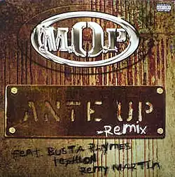 "Ante Up (Robbing-Hoodz Theory)" (rendered on digital platforms as "Ante Up (Robbin Hoodz Theory)", and also simply known as "Ante Up") is a song by American hip hop duo M.O.P. from their fourth studio album Warriorz (2000). Seen as their breakthrough single, it was released in 2000 and reached number 7 on the UK Singles Chart. A remix of the song features Busta Rhymes, Remy Ma (credited as Remy Martin) and Teflon.[1] The remix CD includes an additional version which features Funkmaster Flex.[2]