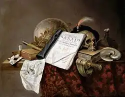 Pieter Steenwijck, Allegory of Death of Tromp, showing the funeral eulogy (Oratio funebris) composed by Thysius for Admiral Maarten Tromp, around 1656. Canvas 79 x 101 cm. Stedelijk Museum De Lakenhal, Leiden.