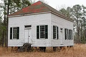 It was added to the National Register of Historic Places in 1977.[1] The church exemplifies the meeting house architectural style. Its exterior features clapboard siding and rests on a low brick pier foundation, topped with a hipped roof covered in pressed tin. The west-facing main façade has double six-paneled doors with a five-paned transom, flanked by a window on each side. The right-side façade includes a single six-paneled door with a four-paned transom, alongside one window to its left and two to its right. Inside, the church maintains its simple design with plastered walls and original hand-hewn pine pews. Windows and doors on each wall allow for ample natural light and ventilation. The only major structural change occurred in the 1930s on the east façade, where two doors were created from original windows to access former Sunday School rooms; these doorways have since been covered as the rooms were removed. The ceiling features exposed natural wood beams. While the church was renovated in 1976 by the South Carolina Disciples of Christ, the interior was not part of this renovation.[5]
