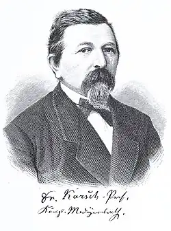 Karsch was born in Münster, the son of district court secretary Ferdinand, and received his early education at the Paulinium Gymnasium. He went to the University of Greifswald in 1842 and received a doctorate in philosophy with a dissertation titled “De quorundam Limnaeorum evolutione" in 1846 and a medical degree with a dissertation titled "De capilliti humani coloribus quaedam". He completed his habilitation at Bonn in 1847 and became a lecturer. In 1948 he became a general practitioner in Münster while also giving lectures. He became a full professor in 1858 and in 1874 he became a member of the medical council. He took an interest in natural history and translated some of Aristotle's works and published on the botany of Westphalia. He was a curator of the natural history museum and was in charge of the herbarium (1848-1871) and the botanical garden (1854-1867). Karsch wrote in the interdisciplinary journal “Natur und Offenbarung” which he helped found and edit from its inception in 1855, writing both on nature and philosophy. He began to study living forms under the microscope, writing about the life of a gnat in 1855, describing microscopic structures of insects and plants. He examined the stomata of leaves and suggested that they might be the point of entry for plant pathogens. He also suggested that plant cells might be able to communicate with each other to respond to microbial infections using the intercellular spaces in an 1855 note on potato diseases.[1] In 1862 he wrote a book appreciating homeopathy.[2] He also wrote a theological text titled as the natural history of the devil ("Naturgeschichte des Teufels") in 1877.[3]
