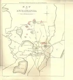 1890 map of Anuradhapura by Harry Charles Purvis Bell showing the location of the Mahavihara