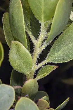 The Arctostaphylos klamathensis is a low-lying, matted shrub forming tangles and mounds no taller than one half meter. Its foliage and twigs are coated with glandular bristles. The leaves are dull, rough, and up to 3.5 centimeters long. The inflorescence is a rounded cluster of manzanita flowers, and it bears spherical drupes with seeds fused into a single hard body.