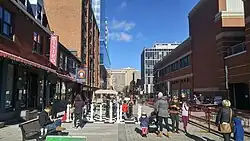 Following the pilot project, the same section of Argyle Street was completely reconstructed (along with part of Grafton Street) as an "urban plaza".[7] Ekistics Plan + Design out of Dartmouth, NS, was engaged for the detailed design of the project.[8] The conventional asphalt and sidewalk were replaced with high-quality pavers, and the street was made level with few curbs. The street remained one-way, as it had before. The pedestrian zone was widened, allowing businesses to keep furniture outdoors year-round and obviating the need for the previous temporary boardwalks.[9] A city planner explained that the project would support the entertainment industry, improve the pedestrian environment, and increase the number of trees along the street.[7] The street remains open to traffic but can be closed to allow for outdoor concerts, festivals, and other events. It functions similar to a shared space, an urban design approach that seeks to minimize segregation between different modes of transportation.