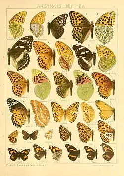 zenobia Leech (71a). Smaller than the previous species [A.childreni], particularly the hindwing less large. Shape and upperside almost exactly as in paphia; fiery reddish yellow, the male with black scent-streaks on the two median branches. The underside as in childreni, but the silverbands anastomose in several places. In North and West China and Tibet. — In penelope Stgr. the male has 3 scent-streaks instead of 2 on the forewing, and the female is shaded with dull greyish green nearly as in the valesina-female of paphia. On the Sutchou, in Amurland and North China. — The butterflies are on the wing in June and July, not being rare in the south and west of the distribution-area, but very rare in the northern districts, on the Ussuri (Doerries).[2]